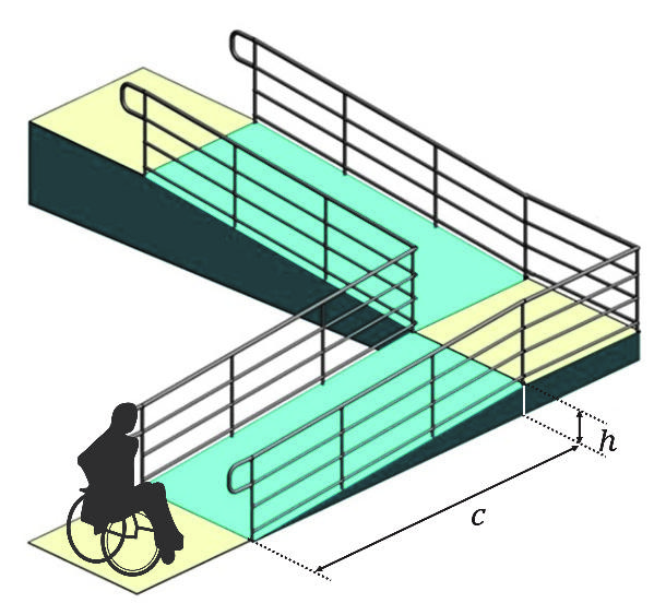 A inclinação 𝑖 da rampa em porcentagem (%) é calculada dividindo a altura ℎ do desnível do segmento da rampa, em metros, pelo comprimento da projeção horizontal 𝑐, em metros, e multiplicando o resultado por 100. A figura a seguir mostra uma rampa de dois segmentos.