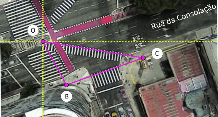A imagem a seguir mostra um cruzamento da Rua da Consolação, na região central da cidade de São Paulo, em que há faixas de pedestre em diferentes direções. Essas faixas agilizam a travessia das ruas. Uma pessoa parte do ponto O e deseja chegar ao ponto C. Para tanto, percorre o trajeto pela faixa que liga O a B e, em seguida, utiliza a faixa que liga B a C. Considere que as coordenadas dos pontos indicados na figura, em metros, são: O(0,0), B(13,-15) e C(29,-8).
