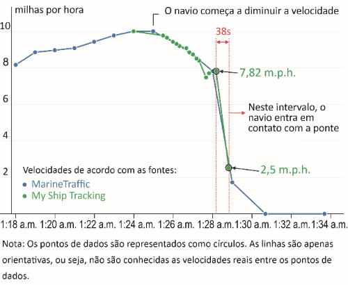 A figura a seguir mostra os dados da velocidade do navio em função da hora local. A colisão ocorreu no intervalo de 38 segundos, marcado por linhas pontilhadas no gráfico.